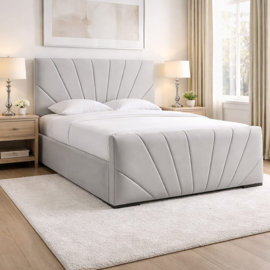 The Aurora Sunrise Panel Bed brings a bold, modern look to the bedroom without feeling heavy or overdone. Its standout design comes from the tall upholstered headboard and matching footboard, both finished with a striking sunrise-style panel pattern. At Knightsbridge Bedding, this bed is a strong choice for buyers who want something softer than a plain frame but cleaner than heavily buttoned styles.