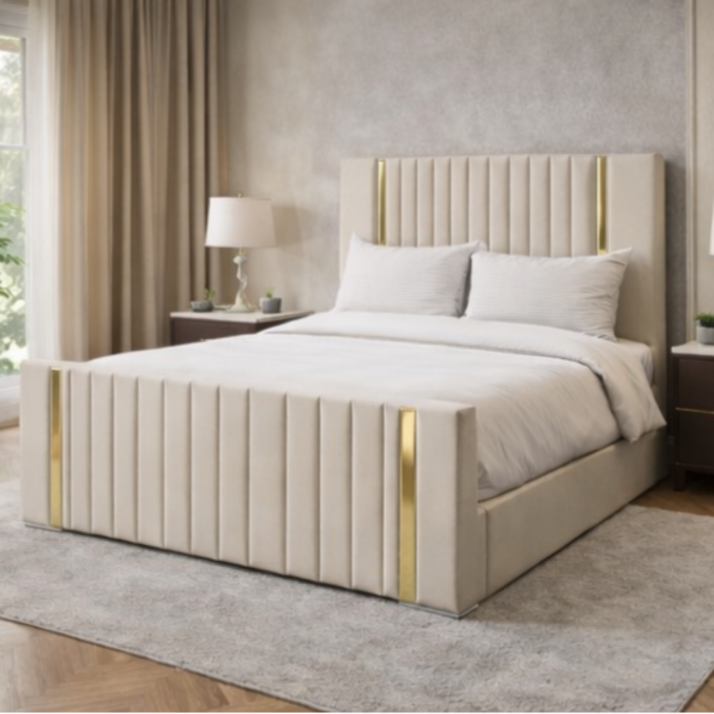 The Savoy Vertical Gold Panel Bed brings a clean, luxury look to the bedroom without feeling too heavy or overdone. Its tall padded headboard, vertical panel design, and gold strip detailing give it a smart, balanced finish. For buyers comparing modern upholstered bed frames, this one stands out for its neat shape, soft texture, and strong visual impact.